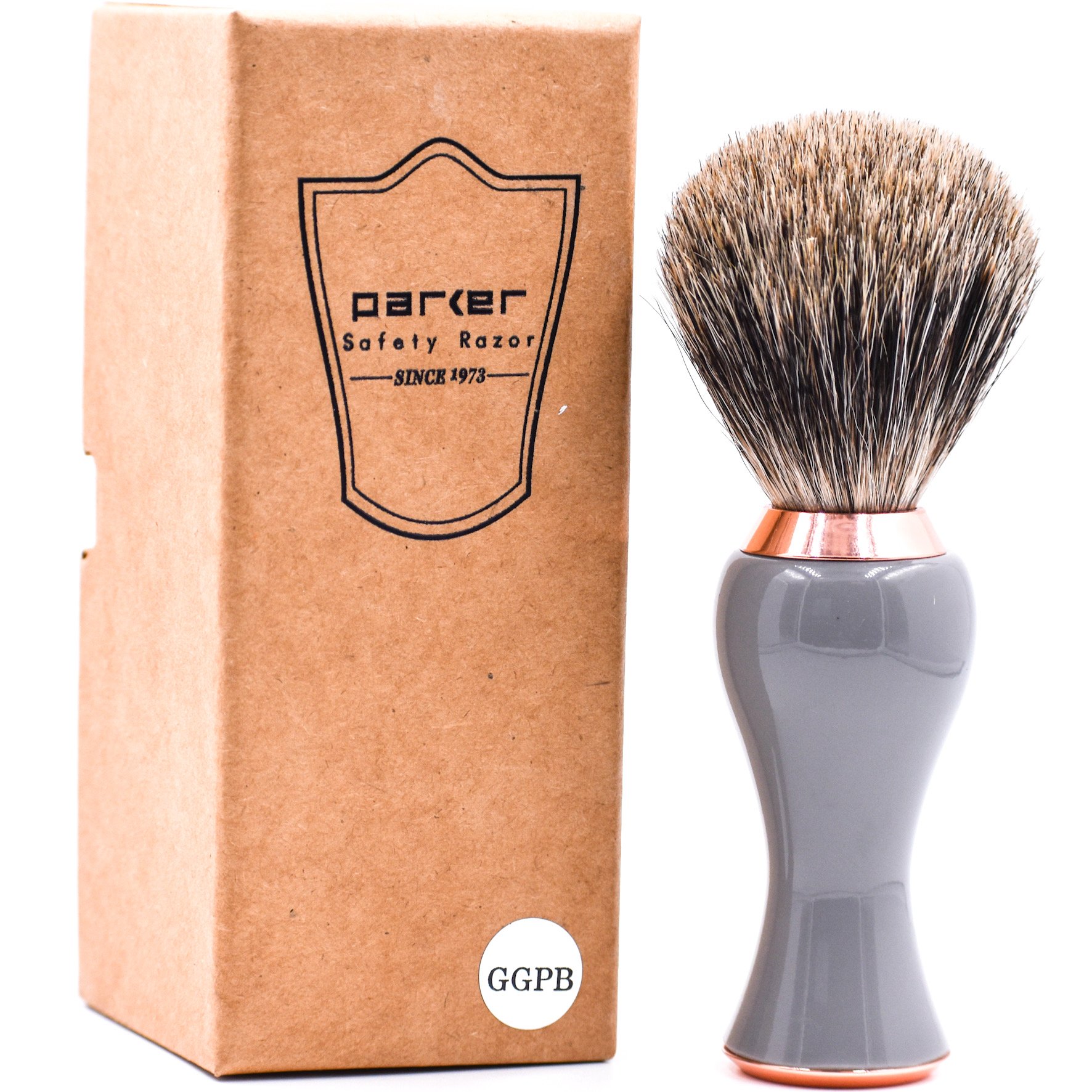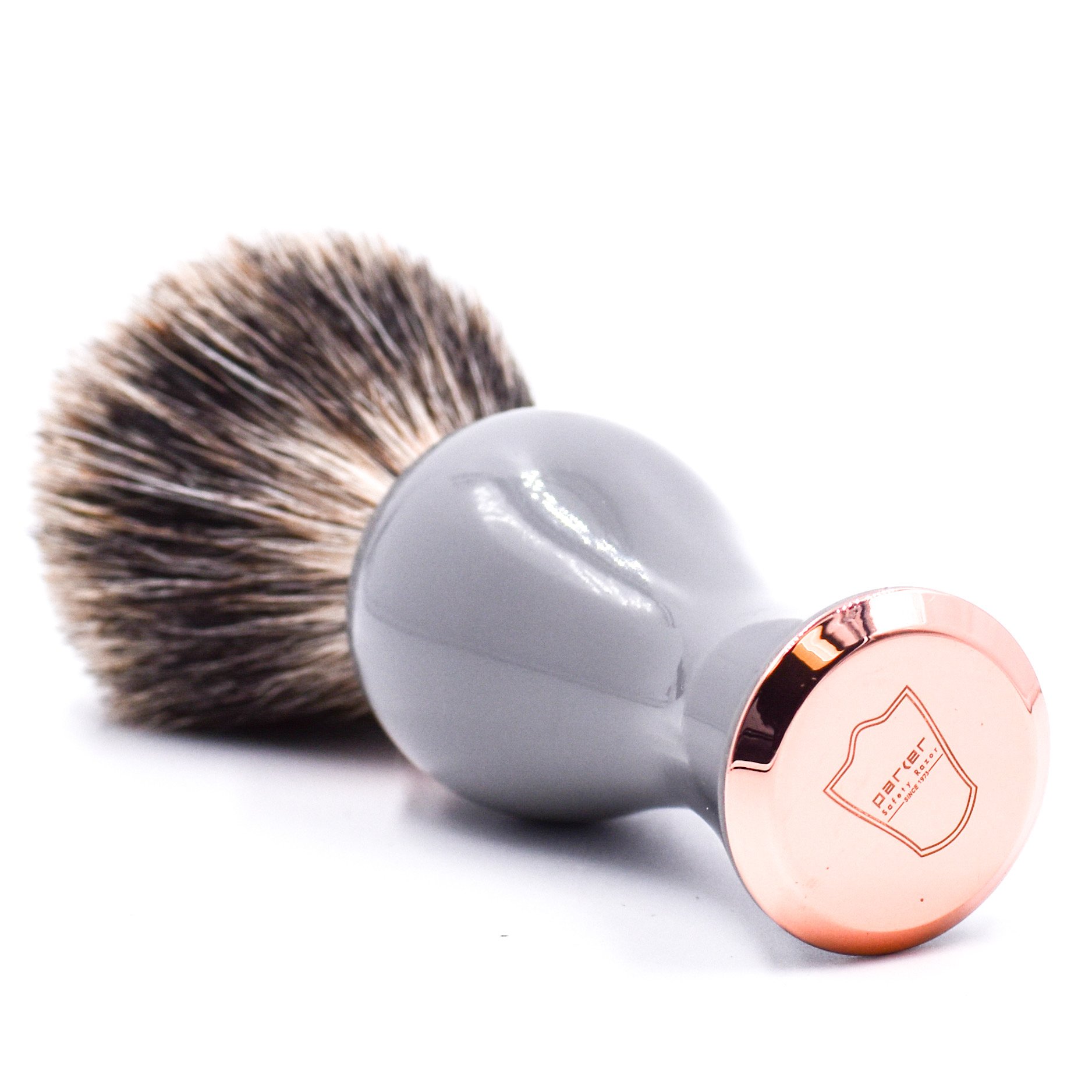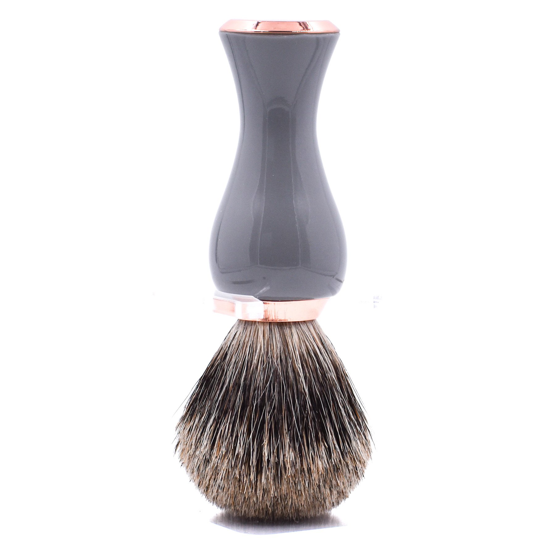 Our 100% Pure Badger Shave brush has a long loft brush knot for extra lathering ability. Not as coarse as black badger, and more firm than silvertip badger, pure badger offers an excellent compromise between stiffness and softness. It creates a fabulous lather and we’re sure you’ll love it. The attractive grey and rose gold slender ergonomic handle was designed for both men and women to make lathering in a deep shave mug easier or for better reach when lathering legs in the shower.