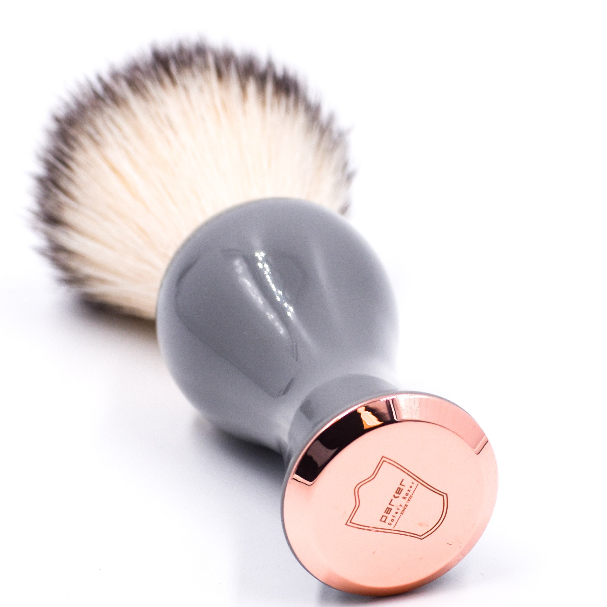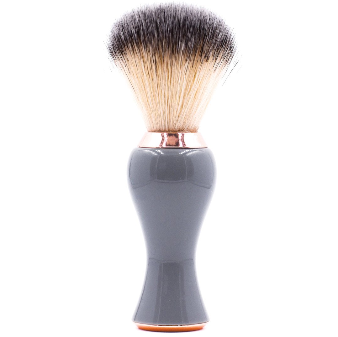 Parker’s synthetic bristle brush is the best alternative to badger and boar brushes for vegans, those who do not want animal products or those with sensitive skin. These extremely soft bristles create an astounding lather. The brush dries quickly, making it ideal for travel or home use. The attractive grey and rose gold slender ergonomic handle was designed for both men and women to make lathering in a deep shave mug easier or for better reach when lathering legs in the shower.