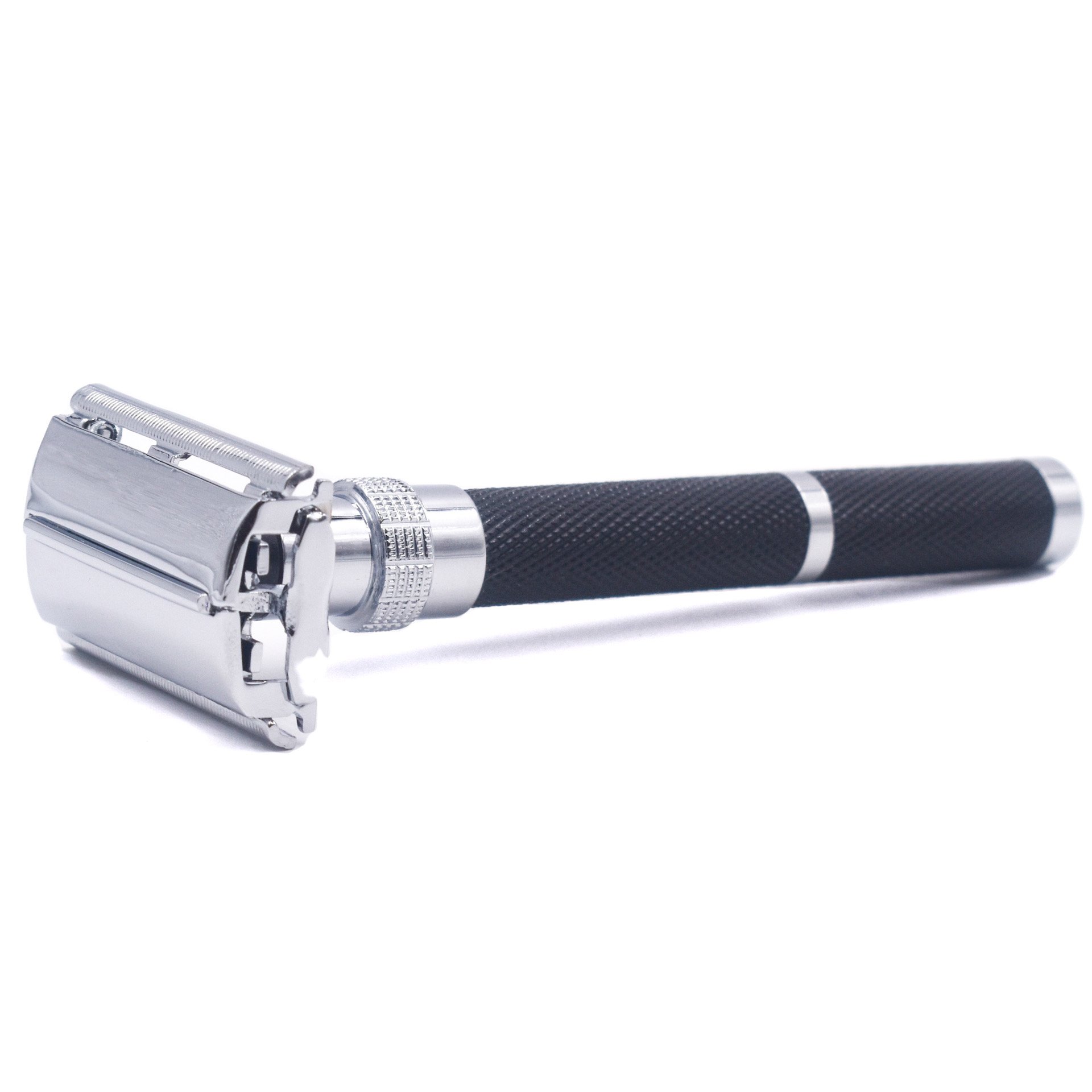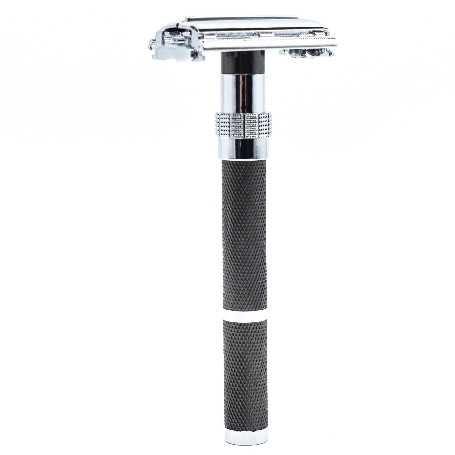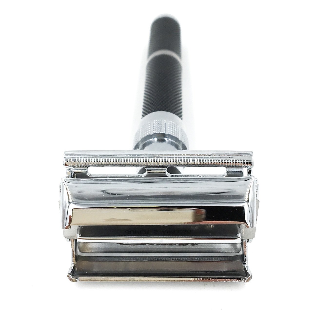 The Parker 96R butterfly open is one of the most popular models based on its classic good looks, intermediate weight and textured graphite and chrome handle. It has a thinner diameter handle, so it is great for those with smaller hands. It has Parker’s precision engineered twist-to-open head, a nice heft and a wonderful balance. This is an excellent razor for new and experienced wet shavers.