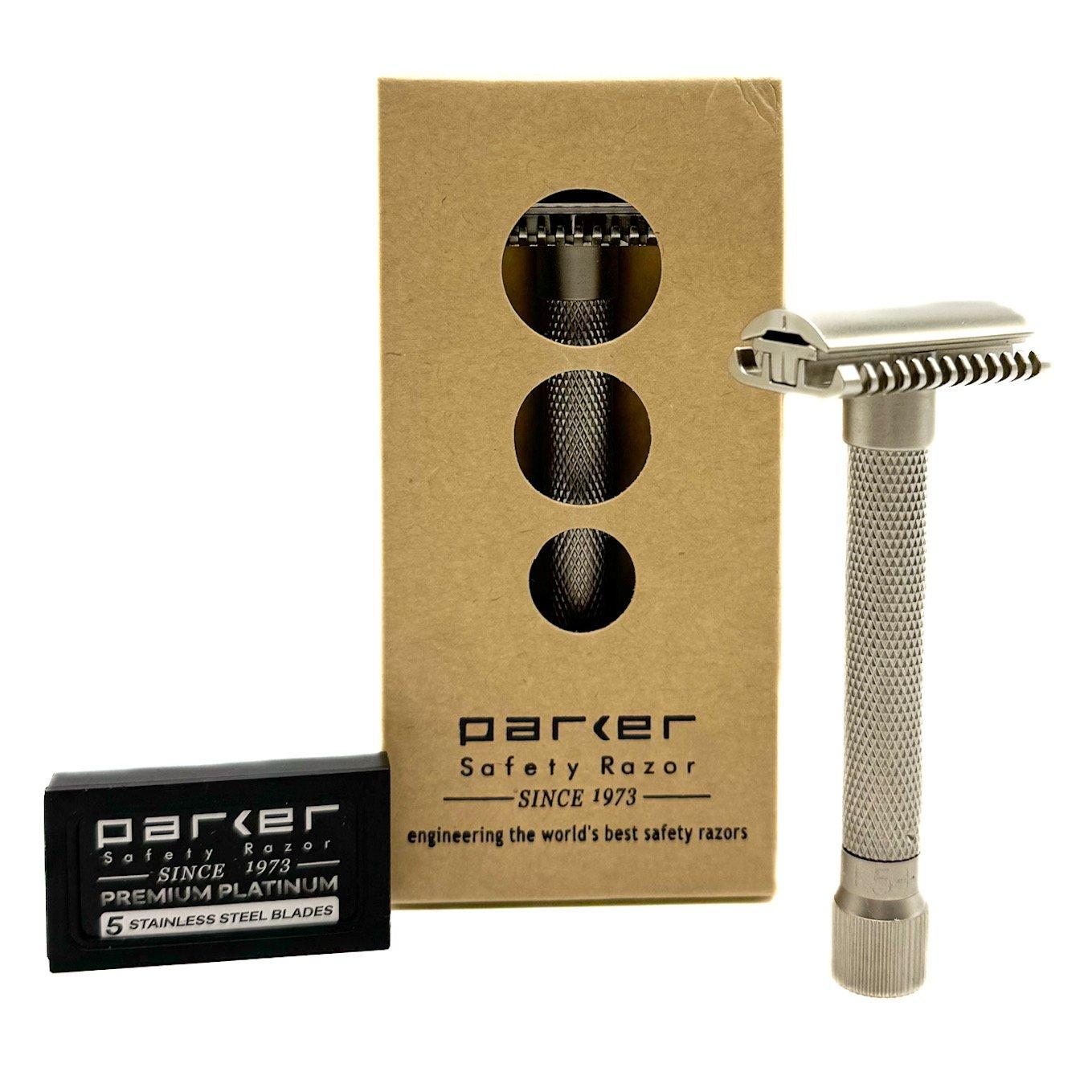 It is the perfect razor for beginners and experts alike. The blade angle can be adjusted by turning the knob on the bottom of the razor, so that the exposure can be set to each individual’s preference. This beautifully designed satin chrome electroplated all brass frame is a heavyweight, smooth shaver. Parker Safety Razor has been making the highest quality, precision engineered safety razors for over 50 years.