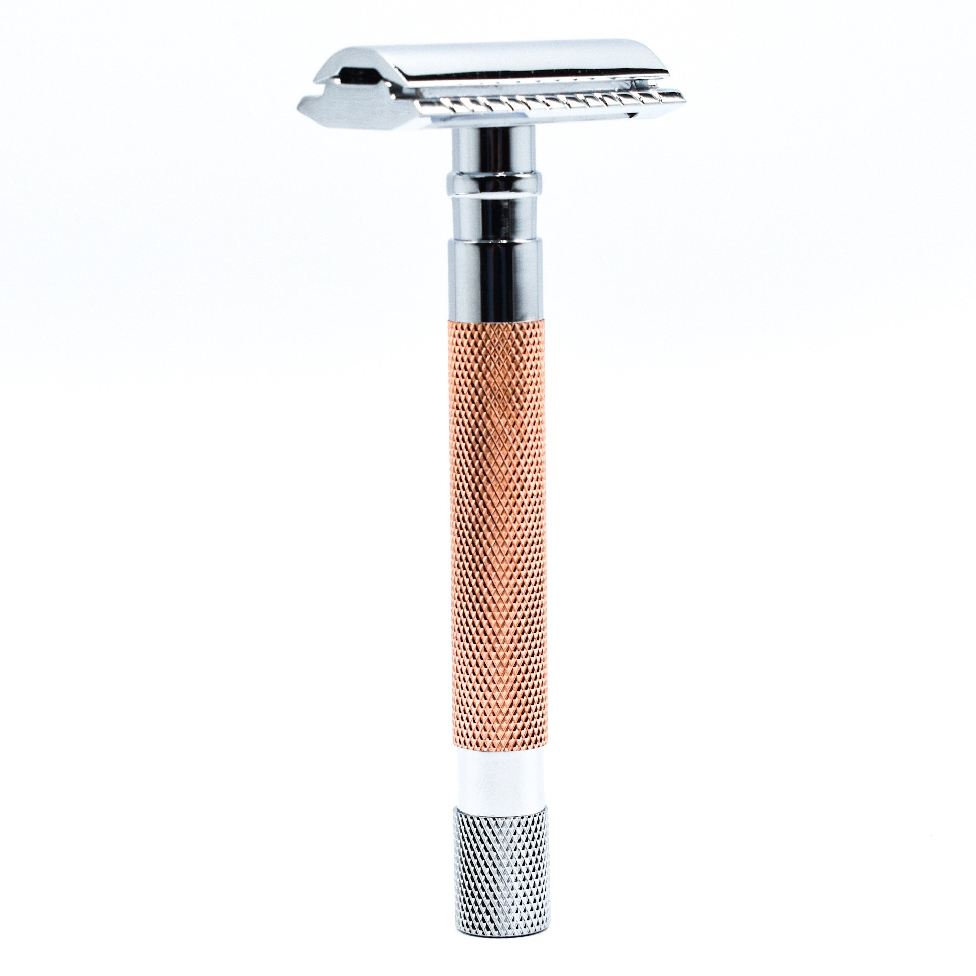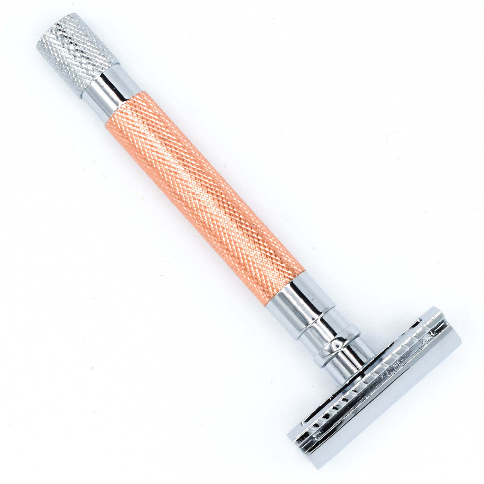 Parker’s 56R-RG heavyweight safety razor is a new 3-piece razor model introduced in late 2020. It is crafted with a handsome rose gold and chrome finish for a luxuriously close and comfortable shave. It has an aggressive textured handle, a nice heft and a wonderful balance. This is an excellent razor for new and experienced wet shavers.