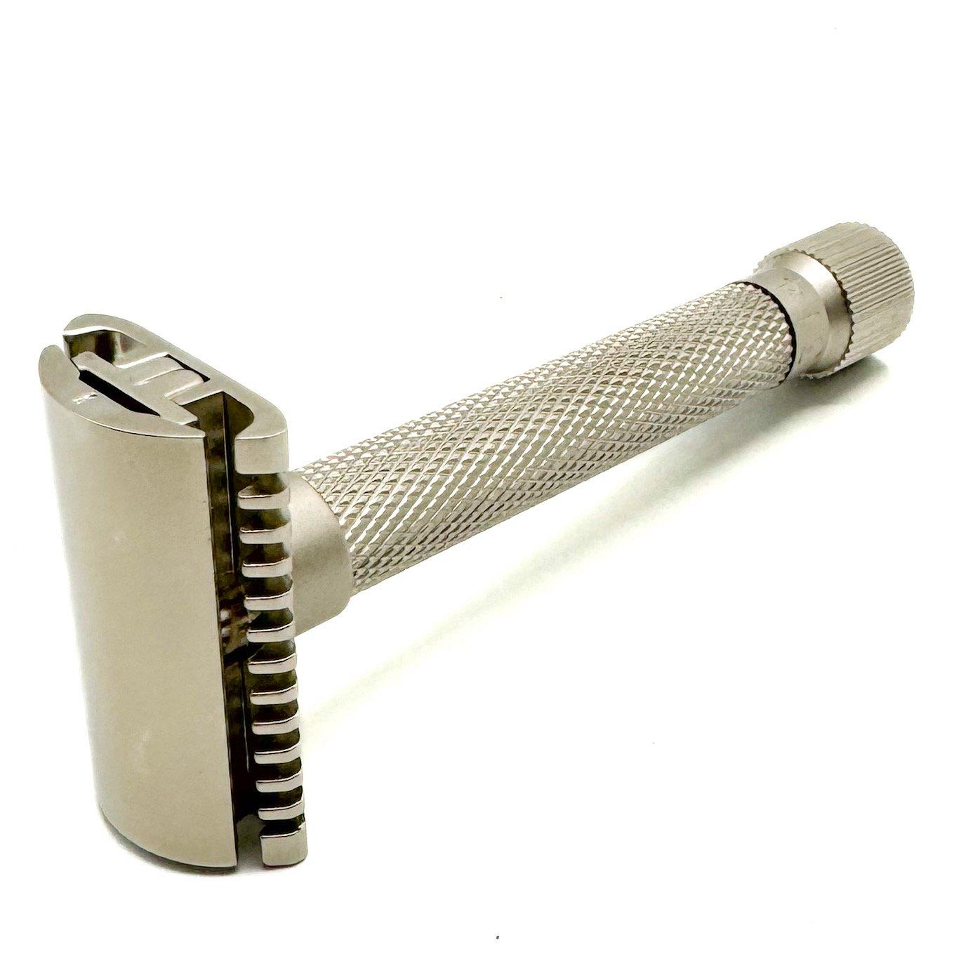It is the perfect razor for beginners and experts alike. The blade angle can be adjusted by turning the knob on the bottom of the razor, so that the exposure can be set to each individual’s preference. This beautifully designed satin chrome electroplated all brass frame is a heavyweight, smooth shaver. Parker Safety Razor has been making the highest quality, precision engineered safety razors for over 50 years.
