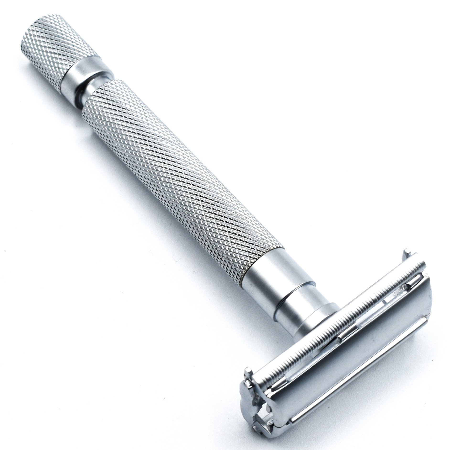 *New Model for 2021* The 74R-SC TTO safety razor is crafted with a handsome satin chrome finish for a luxuriously close and comfortable shave. It has an aggressive textured handle for grip, a nice heft and a wonderful balance. With its traditional butterfly twist-to-open design, changing blades is a snap, making it an excellent razor for new and experienced wet shavers!